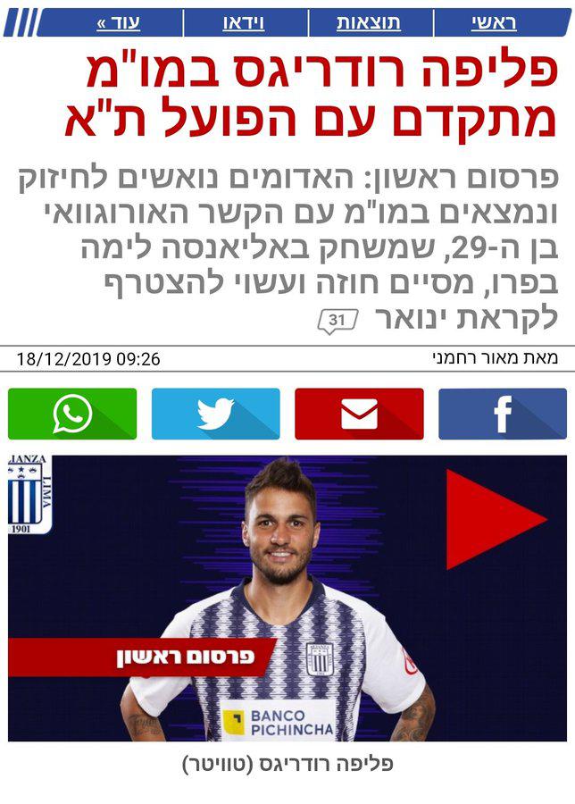 Desde Israel informan lo siguiente: “Felipe Rodríguez en negociaciones avanzadas con Hapoel Tel Aviv. Los rojos están desesperados por fortalecerse y están en conversaciones con el centrocampista uruguayo de 29 años, que juega en Alianza Lima, concluye el contrato y puede unirse el 31 de enero”, indica el portal ONE de Israel. El contrato que ofrece el conjunto israelí es por un año y medio.