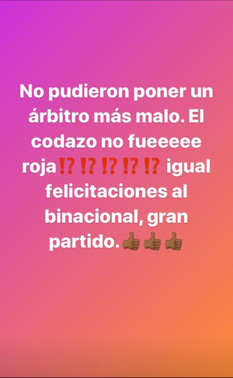 “No pudieron poner a un árbitro más malo, ¿el codazo no fue tarjeta roja? Igual, felicitaciones a Binacional. Gran partido”, dijo Jefferson Farfán en una historia de Instagram.