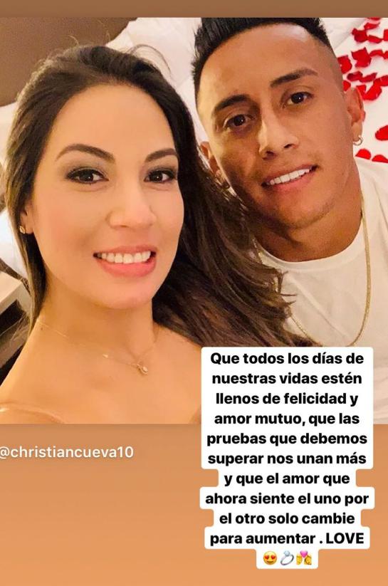 “Que todos los días de nuestras vidas estén llenos de felicidad y amor mutuo, que las pruebas que debemos superar nos unan más y que el amor que ahora siente el uno por el otro solo cambie para aumentar. LOVE”, publicó Christian Cueva a través de Instagram en una foto donde aparece junto a Pamela López.