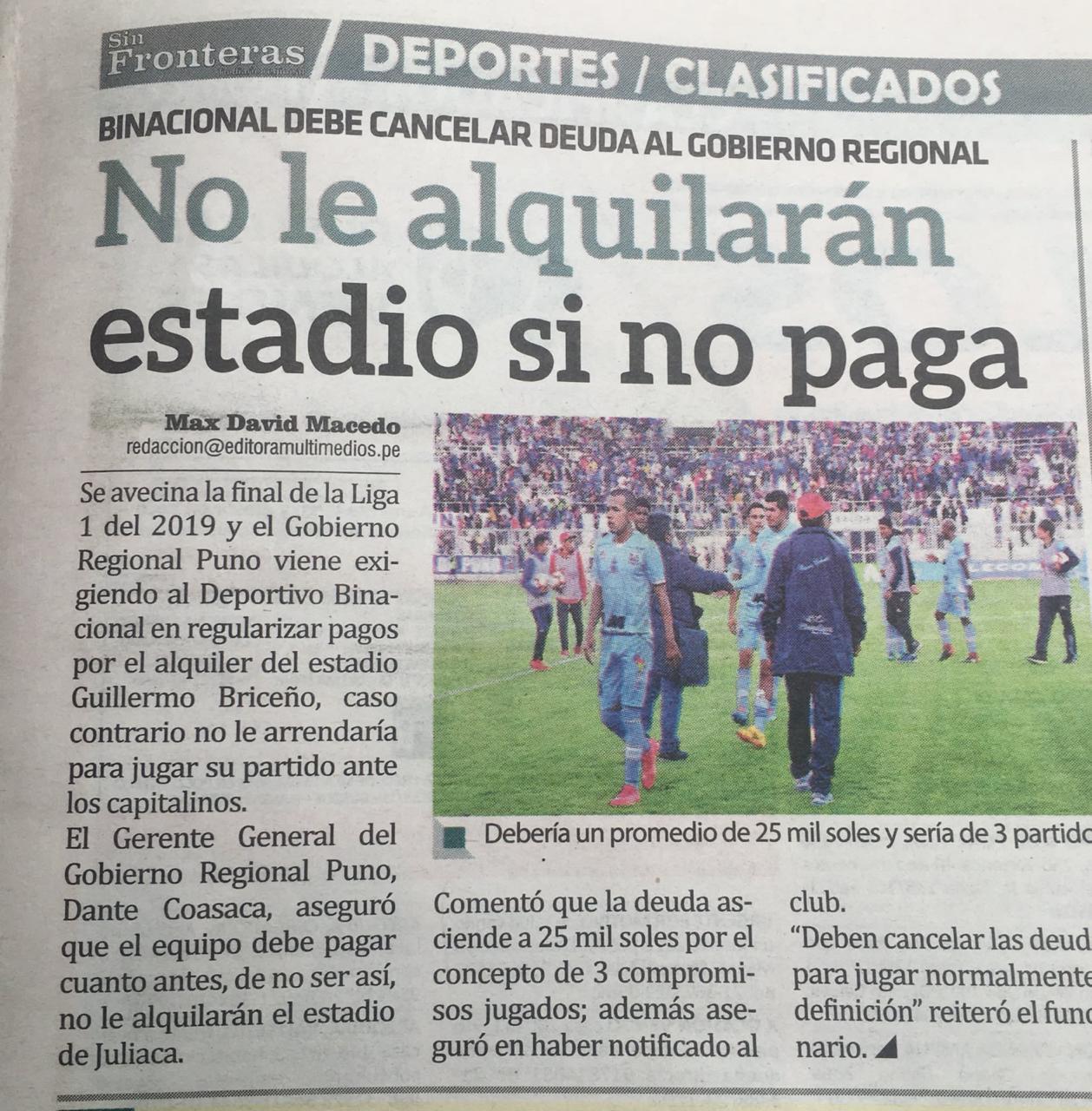Esta información se dio a conocer en el diario Sin Fronteras de Juliaca. “El Gerente General del Gobierno Regional de Puno, Danto Coasaca aseguró que el equipo debe pagar cuanto antes, y de no ser así, no le alquilarán el estadio”, se puede leer en el diario.