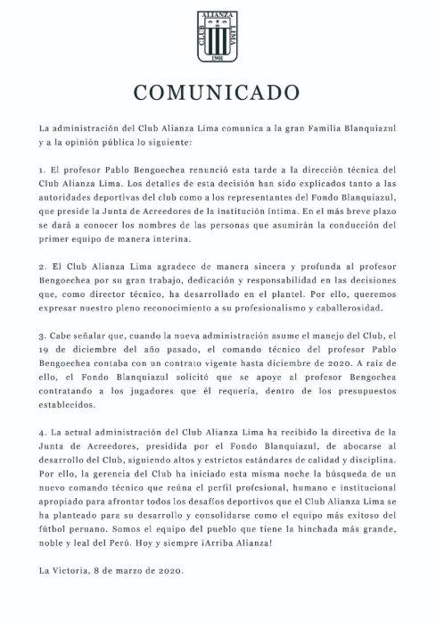 A la medianoche de este lunes 9 de marzo, la administración de Alianza Lima ha hecho oficial la salida de Pablo Bengoechea, culminando así su segundo periodo al mando de los blanquiazules. En un comunicado de prensa, se informó que el estratega “renuncio a la dirección técnica del Club Alianza Lima”.