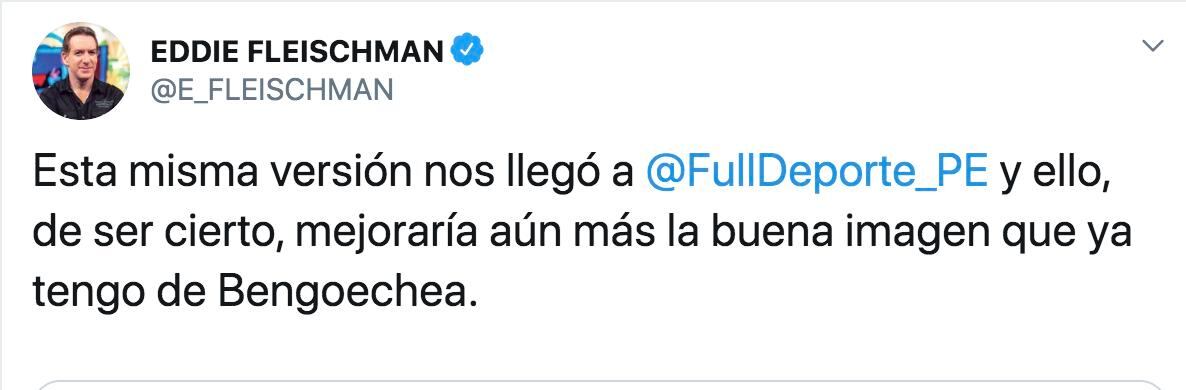 “Esta misma versión nos llegó y ello, de ser cierto, mejoraría aún más la buena imagen que ya tengo de Bengoechea”, escribió el comentarista deportivo en su cuenta de Twitter.