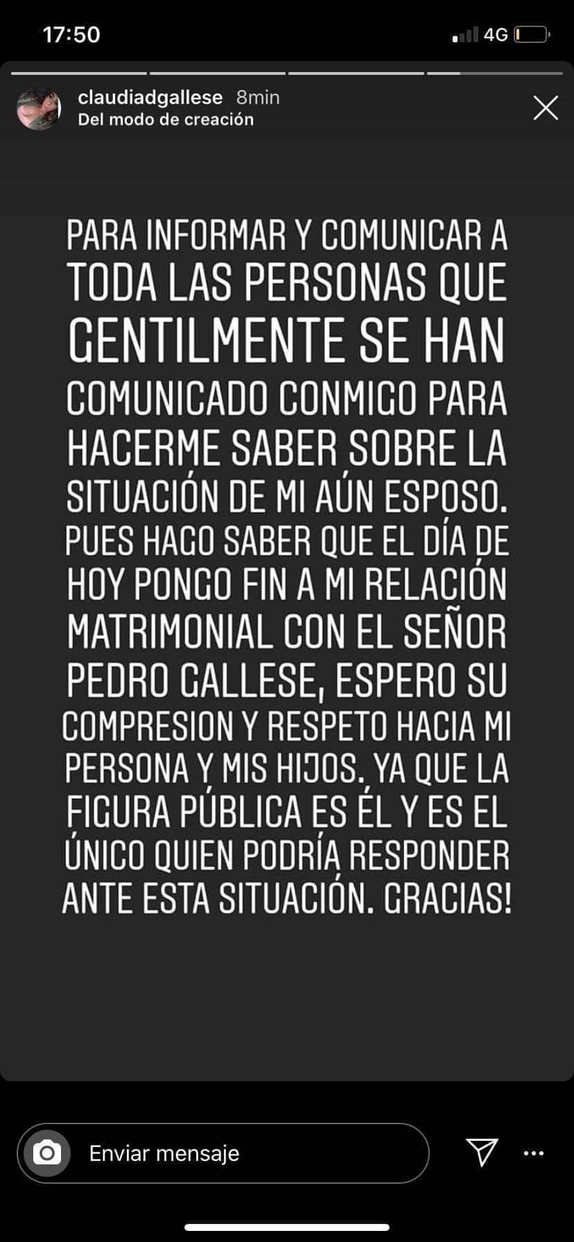 ‘Hago saber que el día de hoy pongo fin a mi relación matrimonial con el señor Pedro Gallese, espero su compresión y respeto hacia mi persona y mis hijos, ya que la figura pública es él y el él el único quien podría responder ante esta situación’, es parte de lo que escribió Claudia Díaz en su cuenta de Instagram.