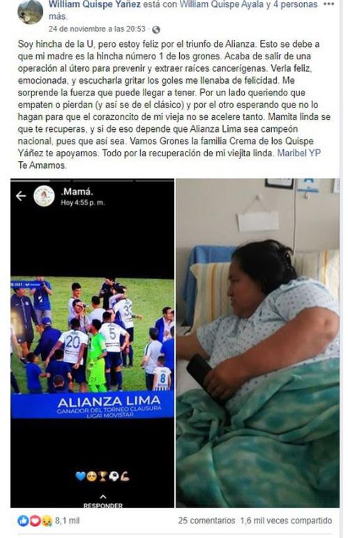 ‘Soy hincha de Universitario, pero estoy feliz por el triunfo de Alianza. Esto se debe a que mi madre es la hincha número 1 de los ‘grones’. Acaba de salir de una operación al útero para prevenir y extraer raíces cancerígenas’, aseguró en una publicación que circuló con fuerza en Facebook.