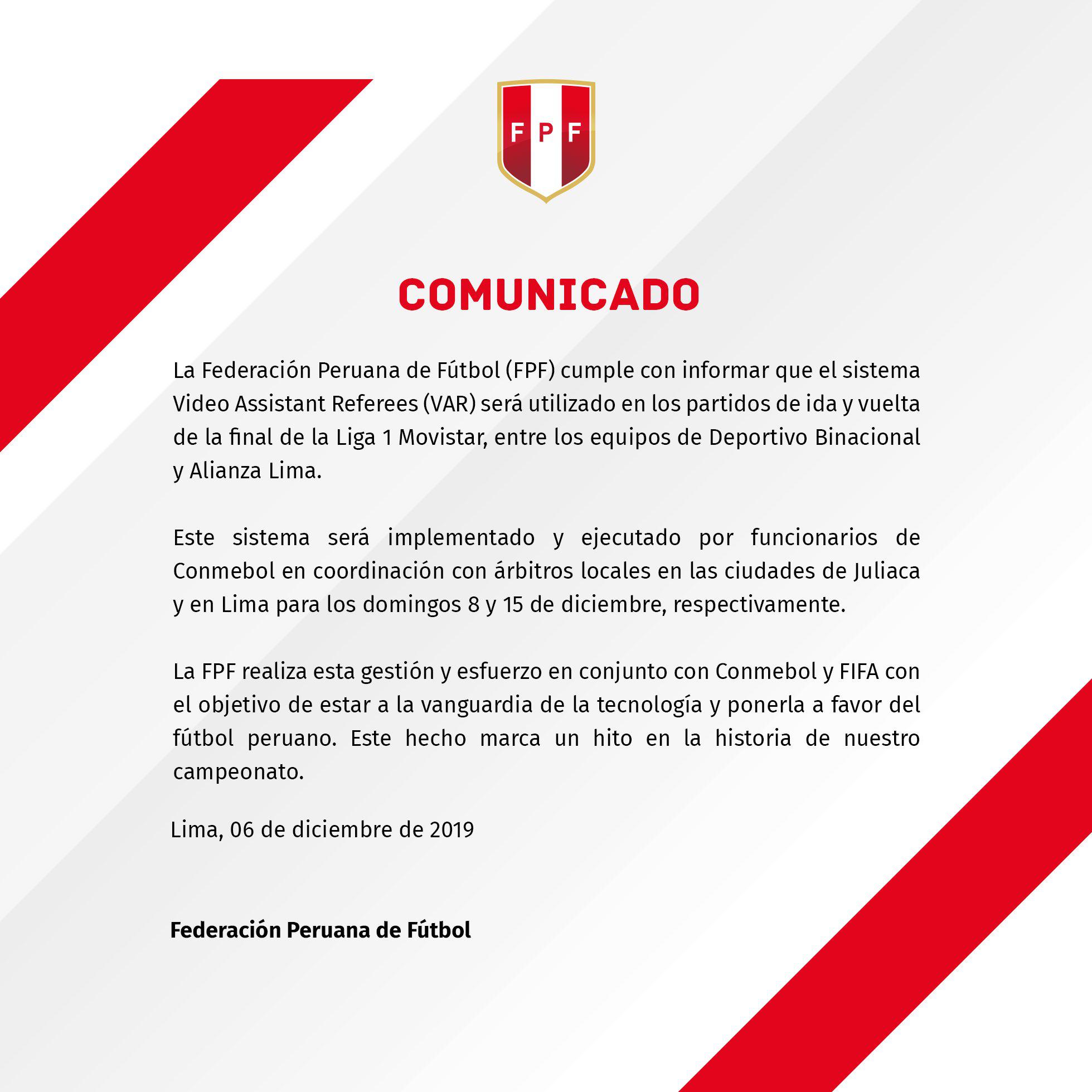 El uso del VAR en la final de la Liga 1 entre Alianza Lima vs. Binacional ya fue confirmado por la Conar, pero el correcto funcionamiento del mismo ha sido garantizado este viernes por la FPF que emitió un comunicado informando la implementación de este sistema de alta tecnología con el apoyo de Conmebol y FIFA. Ahora sí, que empiece la fiesta.
