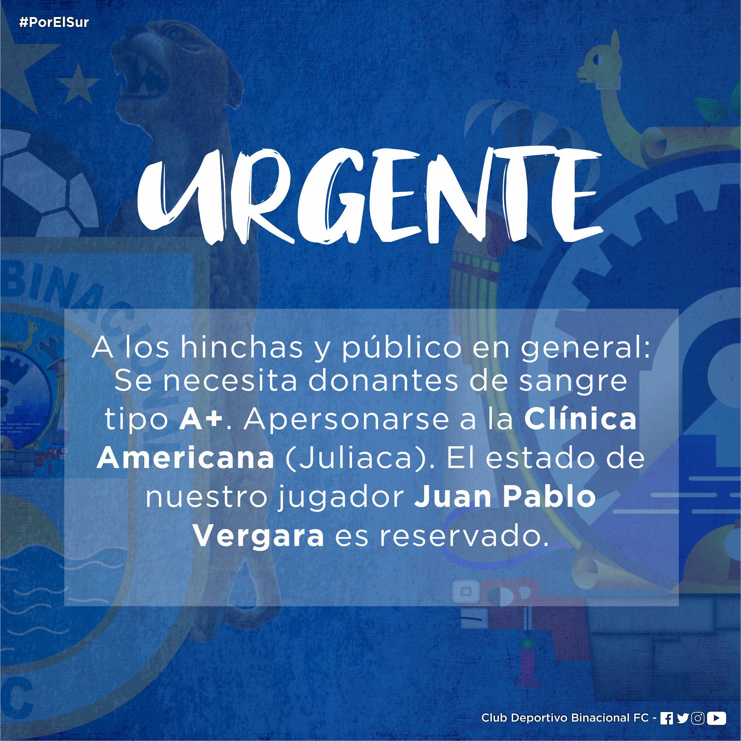 Su salud se complica. El Club Binacional anunció esta noche que se busca con urgencia donantes de sangre para el futbolista Juan Pablo Vergara, mencionando que el estado de salud del deportista es reservado.