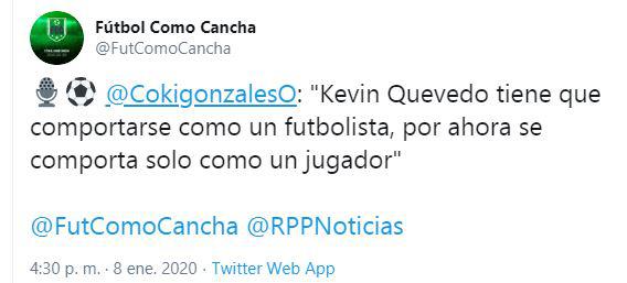 Con este presente, sumado a las posibles ofertas que pueda tener del fútbol del extranjero, el periodista Coki Gónzales habló acerca del momento de Kevin Quevedo: "Tiene que comportarse como futbolista, por ahora solo lo hace como jugador”, indicó en el programa ‘Fútbol Como Cancha’.