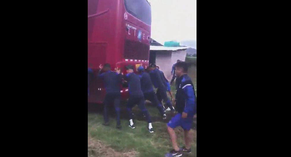 Carlos A Mannucci vivió una odisea antes, durante y hasta después; se quedaron varados en el trayecto a Cajamarca por un huaico, en el partido sufrieron con una cancha en mal estado y para rematar, tuvieron que empujar su vehículo para desestancar sus llantas.Foto: Twitter Manuel Heredia