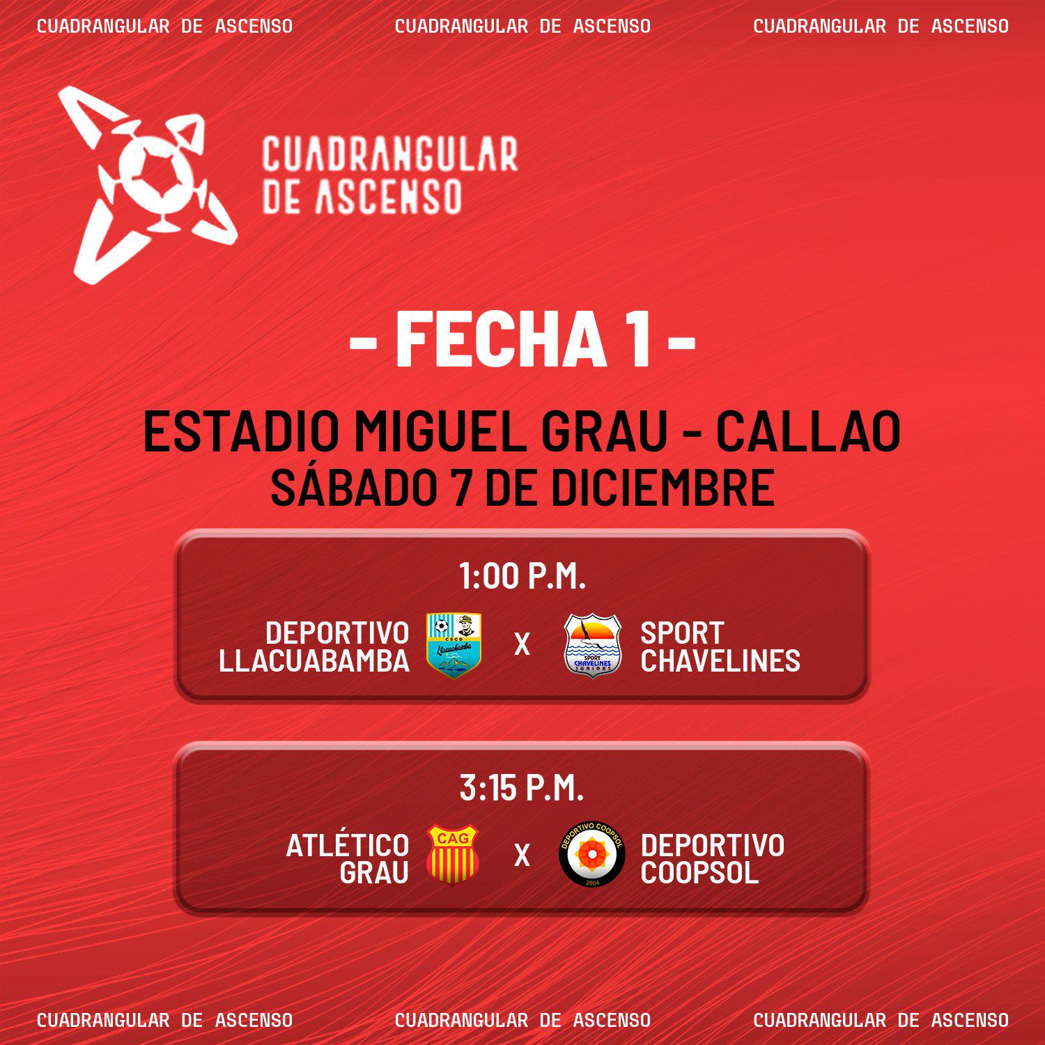 | Fecha 1- sábado 7 de diciembre | Deportivo LLacuabamba vs. Sport Chavelines / 1:00 p.m. | Atlético Grau vs. Deportivo Coopsol / 3:15 p.m |