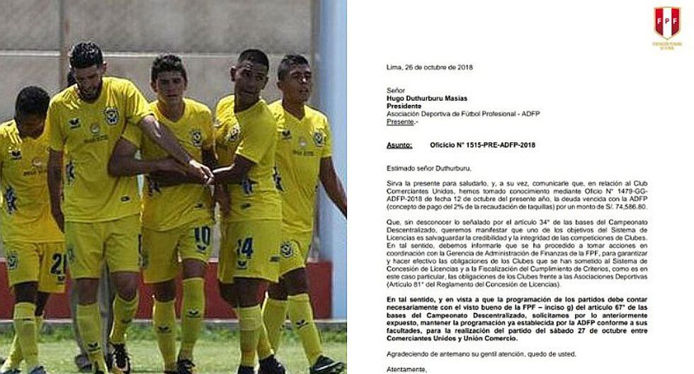 Se juega. El partido entre Comerciantes Unidos y Unión Comercio por la fecha 10 del Torneo Clausura, sí se jugará este sábado a las 3:30 pm en Cajamarca. Pues hasta la noche del viernes, el partido fue suspendido debido a que el equipo cutervino mantenía deudas con la ADFP y el vicepresidente de dicha entidad comunicó que el equipo local perdía por Walk Over.