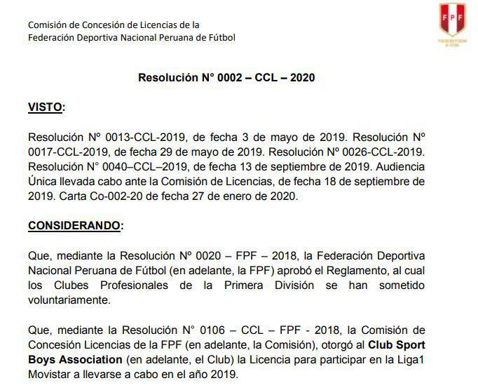 La Comisión de Licencias de la Federación Peruana de Fútbol, mediante un comunicado informó que Sport Boys mantiene deudas con la FPF y SAFAP. La misiva lleva después del debut del equipo rosado en la Liga 1, donde venció de local 3-2 a Deportivo Llacuabamba.