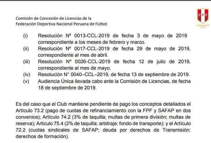 “Mantiene pendiente de pago los conceptos detallados el Artículo 73.2 (pago de cuotas de refinanciamiento con la FPF y SAFAP en dos convenios); Artículo 74.2 (3% de taquilla; multas de primera división; multas de reserva); Articulo 75.4 (2% de taquilla; arbitraje; fondo de transporte); y el Artículo 72.2 (cuotas sindicales de SAFAP; deuda por derechos de Transmisión; derechos de formación)”, indicaron.