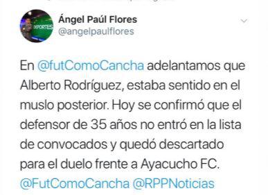 Alberto Rodríguez iba a ser titular en la zaga de Universitario de Deportes junto a Christian Ramos, ya que Nelinho Quina es baja debido a acumulación de amarillas. Alberto seguirá sin jugar en el año a falta de tres fechas para finalizar el Torneo Clausura.