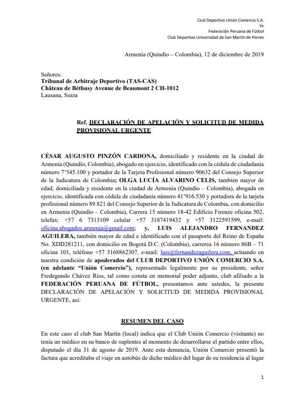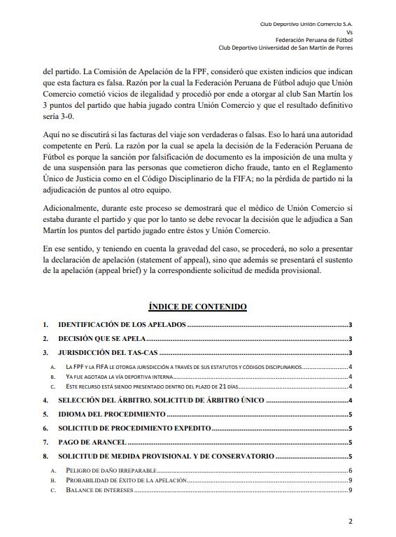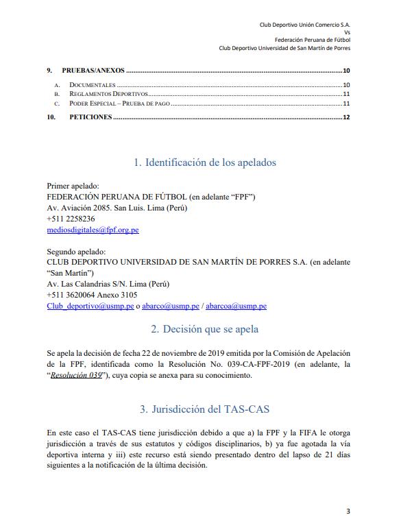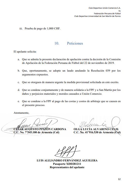 Además, Unión Comercio solicita “que se condene conjuntamente y de manera solidaria a la FPF y a San Martín por los daños y perjuicios materiales y morales causados a Unión Comercio” y “que se condene a la FPF al pago de las costas y costos de arbitraje que se causen en el presente proceso”.