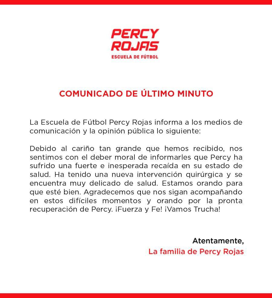 “Nos sentimos con el deber moral de informarles que Percy ha sufrido una fuerte e inesperada recaída en su estado de salud. Ha tenido una nueva intervención quirúrgica y se encuentra muy delicado de salud. Estamos orando para que esté bien. Agradecemos que nos sigan acompañando en estos difíciles momentos y orando por la pronta recuperación de Percy. ¡Fuerza y fe! ¡Vamos Truca!”, fue la publicación realizada.