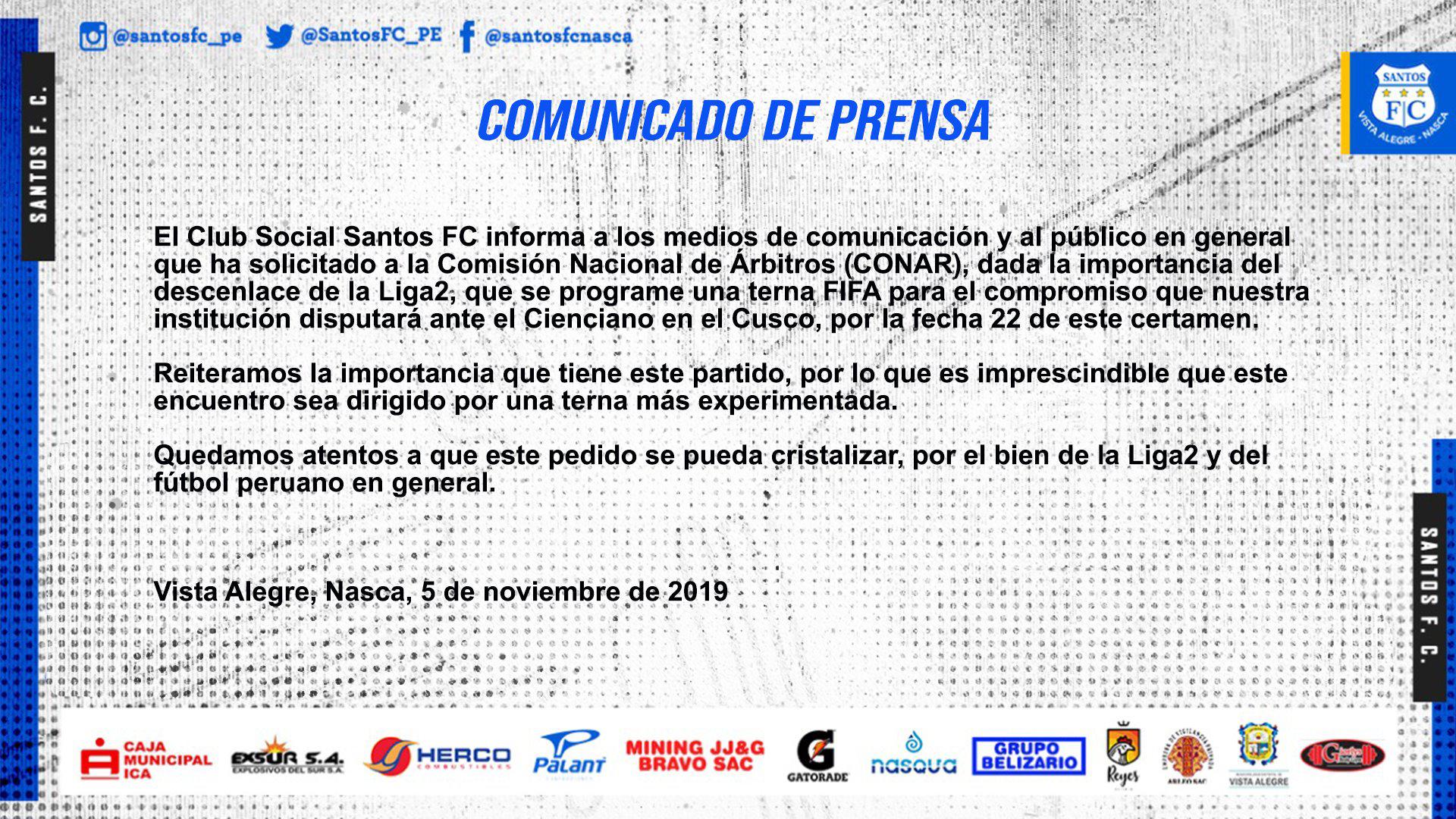 A través de un comunicado de prensa, Santos FC anunció lo siguiente: “El club informa que se ha solicitado a la Comisión Nacional de Árbitros (CONAR), dada la importancia de descenlace de la Liga 2, que se programe una terna FIFA para el compromiso que nuestra institución disputará ante Cienciano en el Cusco, por la fecha 22 de este certamen”, indicó el club de Nasca para este encuentro vital.