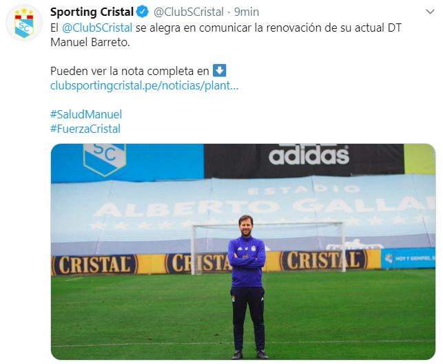 “El Club Sporting Cristal y Manuel Barreto, director técnico del primer equipo, han llegado a un acuerdo para extender dos temporadas (2020-2021), más una opcional (2022), el contrato que une ambas partes”, explicaron en su comunicado.