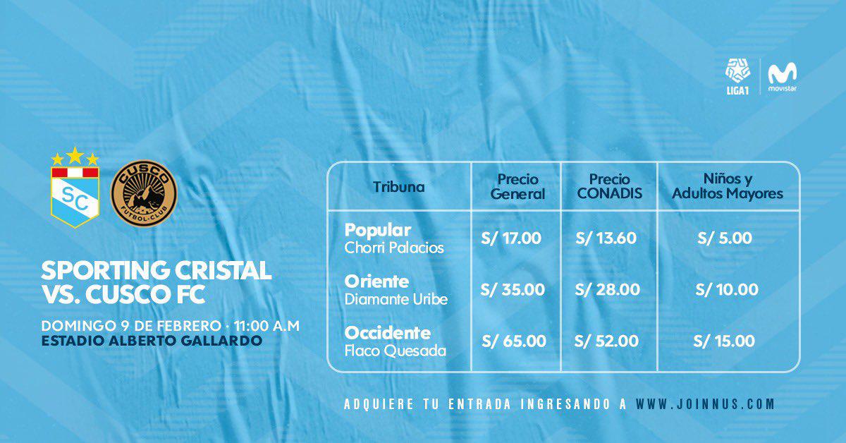 Sporting Cristal debuta este sábado en la Liga 1 frente a UTC en Cajamarca, pero su primer partido como local en el estadio Alberto Gallardo lo hará en la fecha 2, el próximo domingo 9 de febrero a las 11 de la mañana.