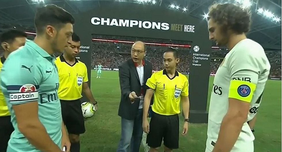 Después del saludo protocolar entre los jugadores del Arsenal y el Paris Saint-Germain, y de la foto respectiva entre los capitanes de ambos equipos con la terna arbitral, uno de los organizadores sacó una tarjeta de crédito ante la atónita mirada de Mezut Ozil y Adrien Rabiot, a quienes no le quedó otra alternativa que asentir ante el pedido del árbitro de elegir una de las caras de la tarjeta.