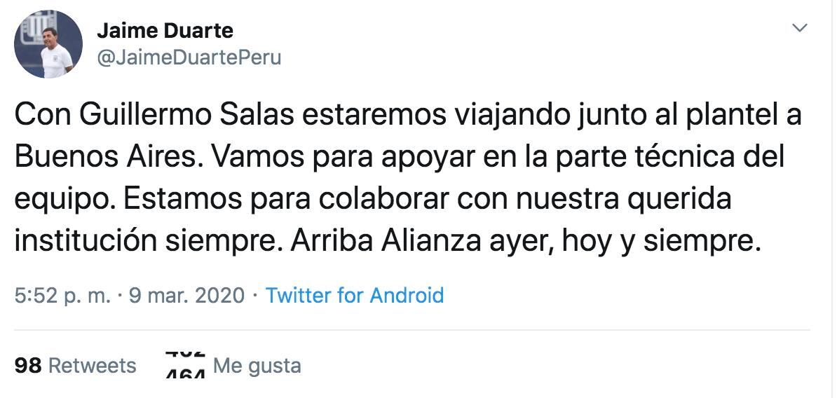 Fue el propio Jaime Duarte quien confirmo su presencia junto a la de ‘Chicho’ Salas en el El Cilindro de Avellaneda. “Con Guillermo Salas estaremos viajando junto al plantel a Buenos Aires. Vamos para apoyar en la parte técnica del equipo. Estamos para colaborar con nuestra querida institución siempre. Arriba Alianza ayer, hoy y siempre”, escribió en su cuenta de Twitter.