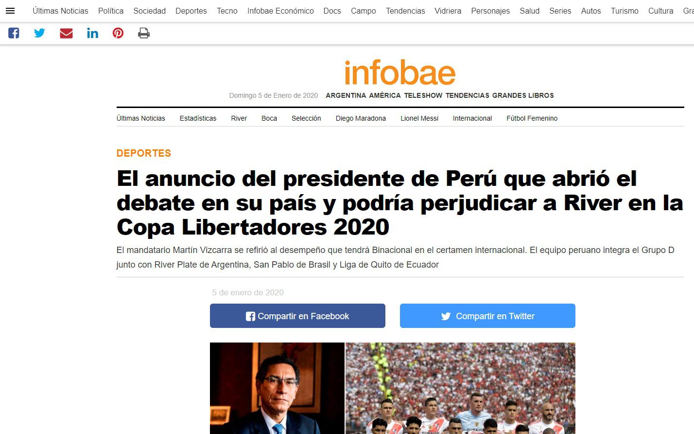 Por ello, algunos medios argentinos se han referido al tema e indican que dicha decisión puede afectar al River Plate de Marcelo Gallardo. Pues así lo informó Infobae en su portal web donde tituló: “El anuncio del presidente de Perú que abrió el debate en su país y podría perjudicar a River en la Copa Libertadores 2020”.