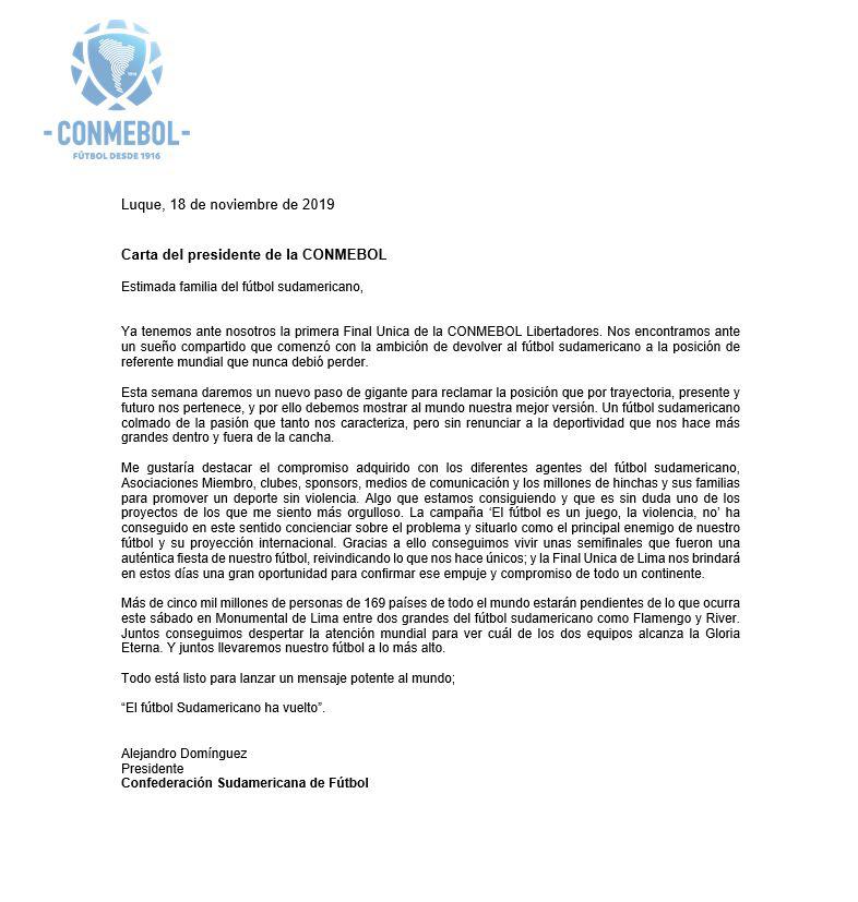 El presidente de la Confederación Sudamericana de Fútbol (Conmebol), Alejandro Domínguez, remitió una carta abierta en que estimó en 5,000 millones el total de la audiencia que tendrá la final de la Copa Libertadores este sábado, entre Flamengo y River Plate.
