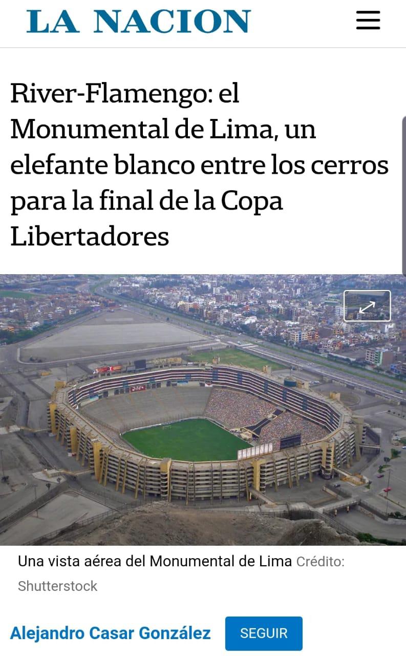 “El nombre ‘Monumental’ deriva de la imponencia de su construcción. Ubicado en las afueras de la capital limeña y cerca de los cerros que la rodean, el estadio insumió más de 40 millones de dólares y fue inaugurado en el año 2000. En rigor, bien puede hablarse del Monumental como un ‘elefante blanco’, ya que se llena una o dos veces por año", dice la publicación.