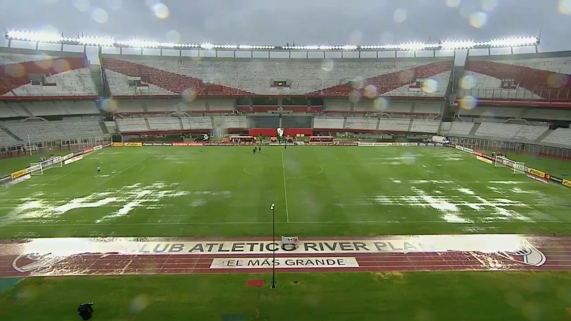 Panorama complicado en Argentina. La lluvia no para en Buenos Aires y en el campo del estadio Monumental se han formado charcos gigantes que no permitirían jugar a River Plate y Deportivo Binacional.