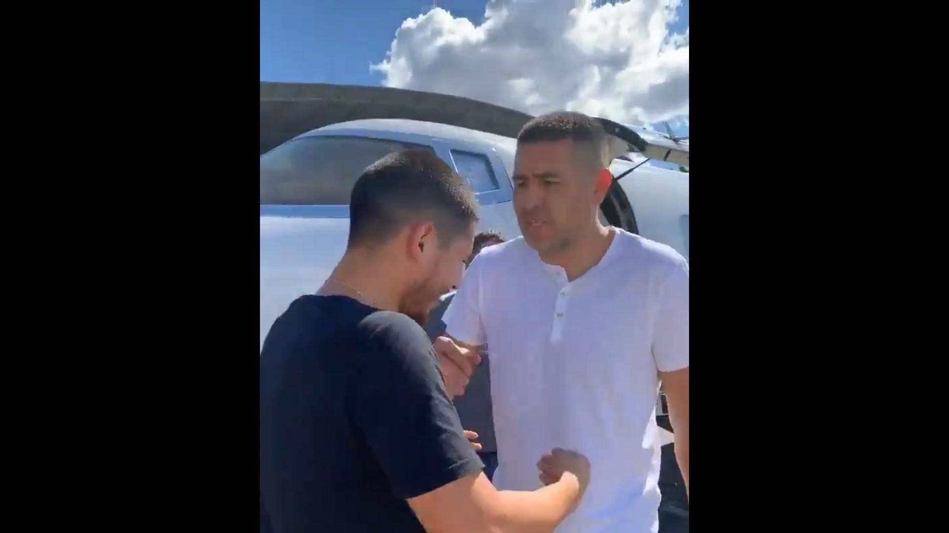 Tras bajar del avión que lo trasladó desde Buenos Aires, Juan Román Riquelme se encontró con un hinchas que comenzó a llorar al ver a su ídolo.