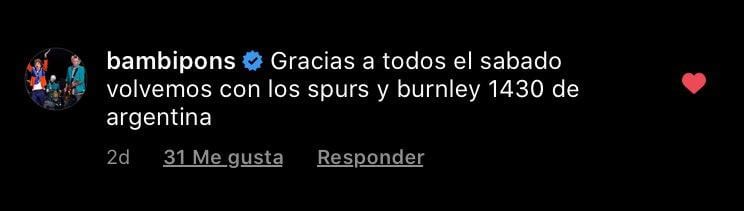 Así lo anunció el propio periodista argentino a través de su Instagram. “Gracias a todos, el sábado volvemos con los Spurs vs Burnley a las 14:30 de Argentina”, se puede leer en un comentario suyo en la red social.