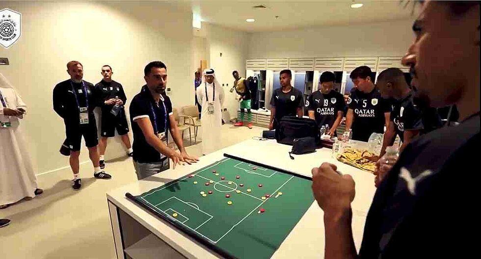 Vestido con polo negro y un pantalón de dril beige, este video en Facebook muestra como Xavi Hernández se preparaba antes de que sus jugadores ingresen al vestuario. Desplegó el pizarrón sobre la mesa, puso la fichitas sobre él y a esperar.