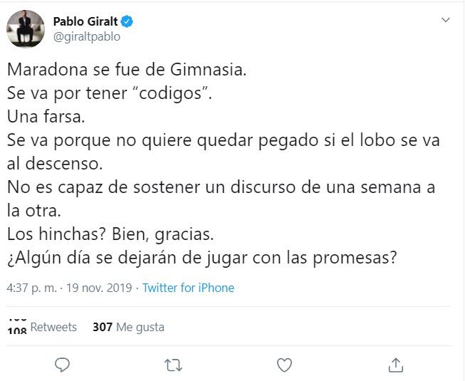 Pablo Giralt, periodista de Directv Sports, no tuvo problema en destrozar a Diego Maradona por renunciar a Gimnasia y Esgrima de la Plata cuando 'el Lobo’ se encuentra en un momento clave del campeonato en el fútbol argentino.