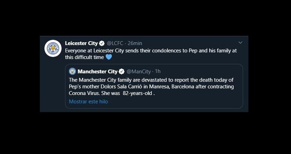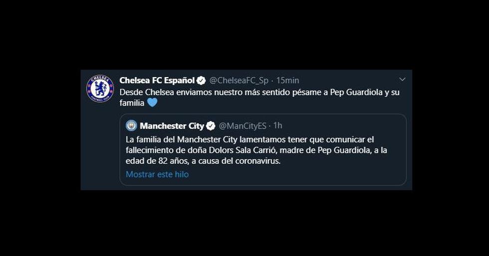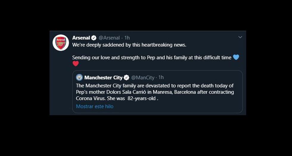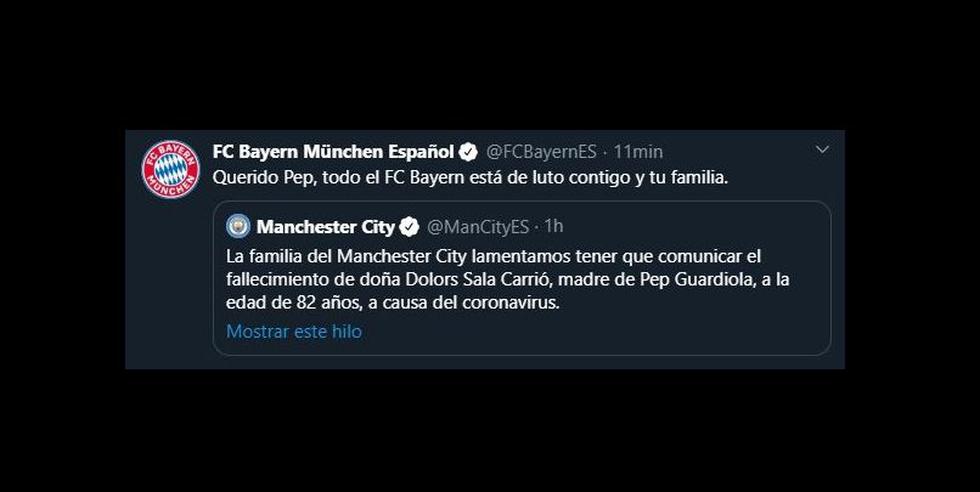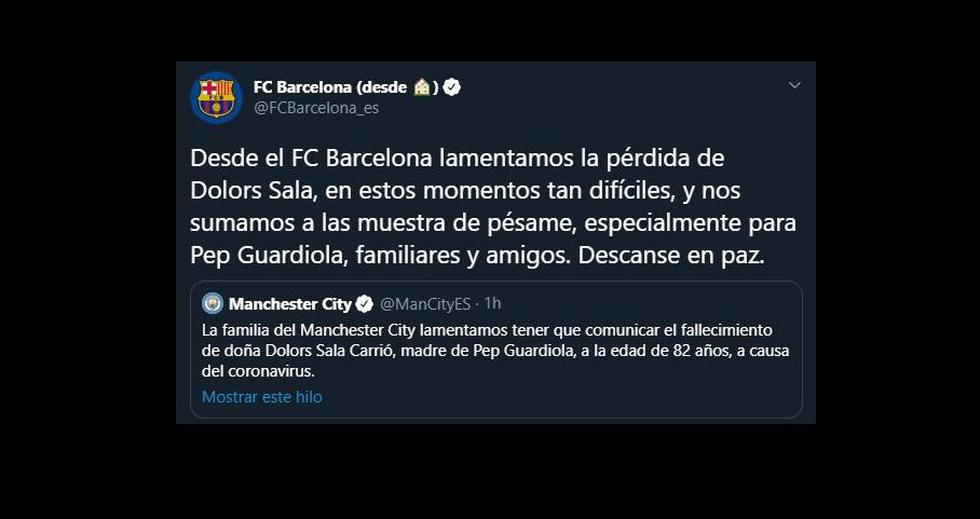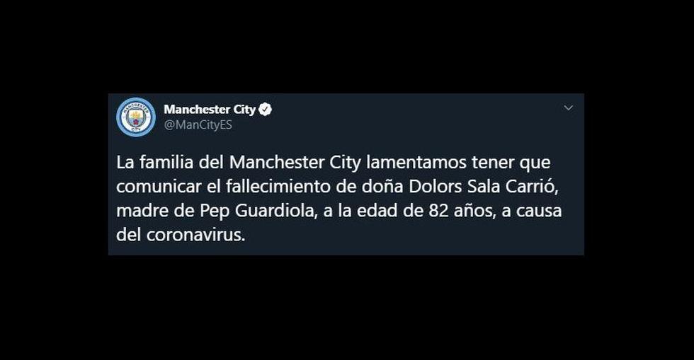 "La familia del Manchester City lamentamos tener que comunicar el fallecimiento de doña Dolors Sala Carrió, madre de Pep Guardiola, a la edad de 82 años, a causa del coronavirus. Todos los que formamos parte del Club queremos manifestar nuestro más sentido pésame a la familia Guardiola en un momento tan doloroso", señaló el club inglés. De inmediato, las instituciones donde el estratega español dejó huella se pronunciaron.