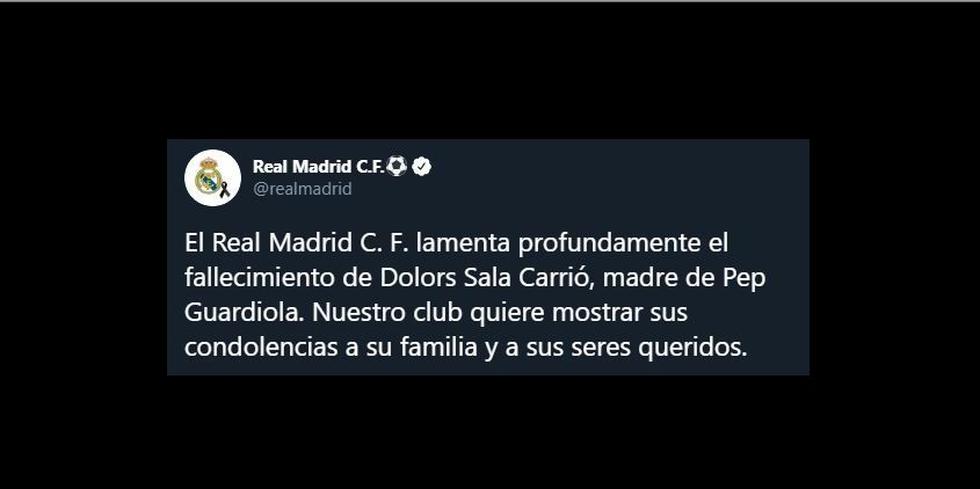 Real Madrid, clásico rival del Barcelona, también se solidarizó con el entrenador por su pérdida. “Real Madrid lamenta profundamente el fallecimiento de Dolors Sala Carrió, madre de Pep Guardiola. Nuestro club quiere mostrar sus condolencias a su familia y a sus seres queridos”, señalaron desde tienda ‘merengue’.