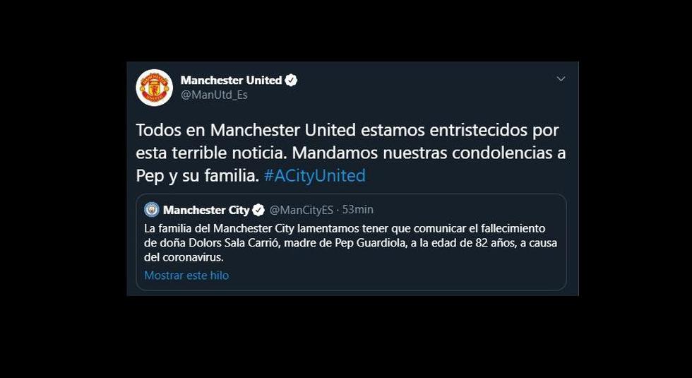 "Todos en Manchester United estamos entristecidos por esta terrible noticia. Mandamos nuestras condolencias a Pep y su familia", agregó el United al compartir el mensaje del City, en otro buen gesto. "Estimado Pep, ¡todo el FC Bayern está tristemente conectado con usted y su familia!", agregó Bayern Múnich, que también incluye a Guardiola en parte de su historia.