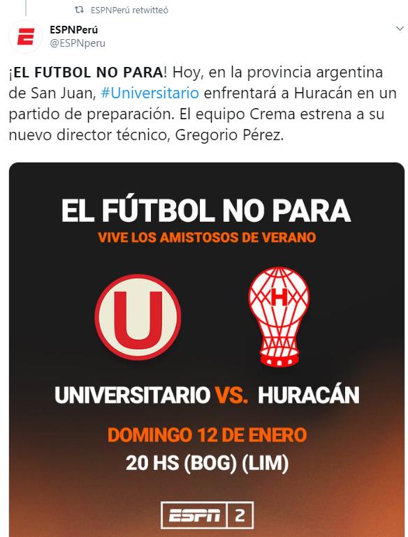 ESPN será el canal encargado de llevar la transmisión del partido entre Universitario y Huracán. Para este compromiso los periodistas peruanos encargados de llevar las riendas de este duelo en San Juan serán: Hernan De Lorenzi (Narración), Franco Lostanau (Comentarios), Vanessa Almenara (Reportera desde el estadio).