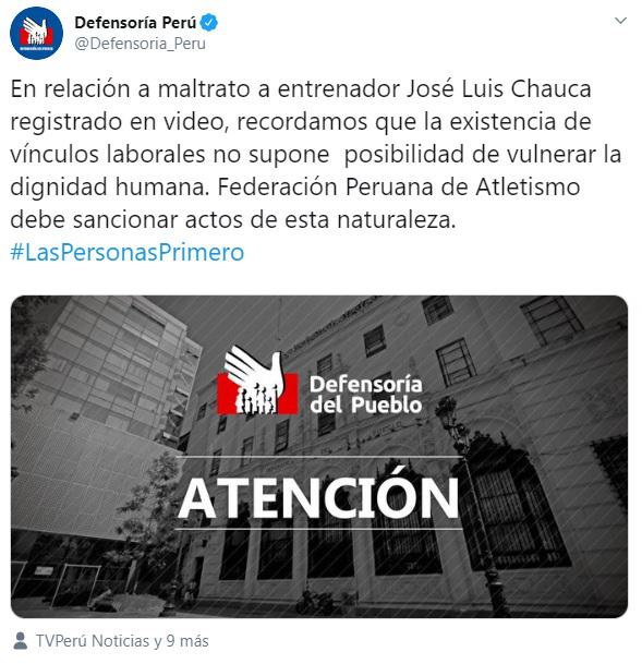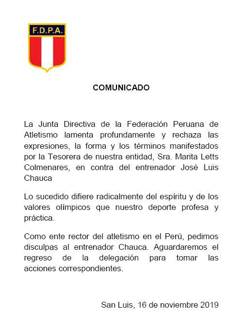 “Pedimos disculpas al entrenador Chauca. Aguardaremos el regreso de la delegación para tomar las acciones correspondientes”, se lee en el comunicadado de la FEDEPEATLE. Mientras que la Defensoría agregó: “Recordamos que la existencia de vínculos laborales no supone posibilidad de vulnerar la dignidad humana. Federación Peruana de Atletismo debe sancionar actos de esta naturaleza”.
