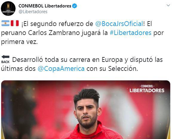 Minutos después de su presentación, la noticia del arribo de Carlos Zambrano a Boca Juniors también fue informada por la cuenta oficial de Twitter, quien además añadió que será la primera participación del defensor de la selección peruana en la Copa Libertadores.