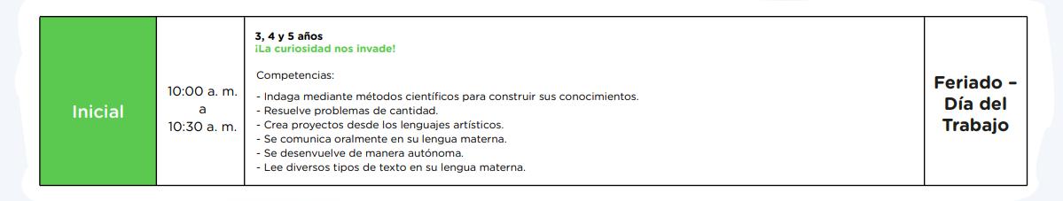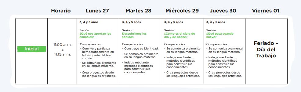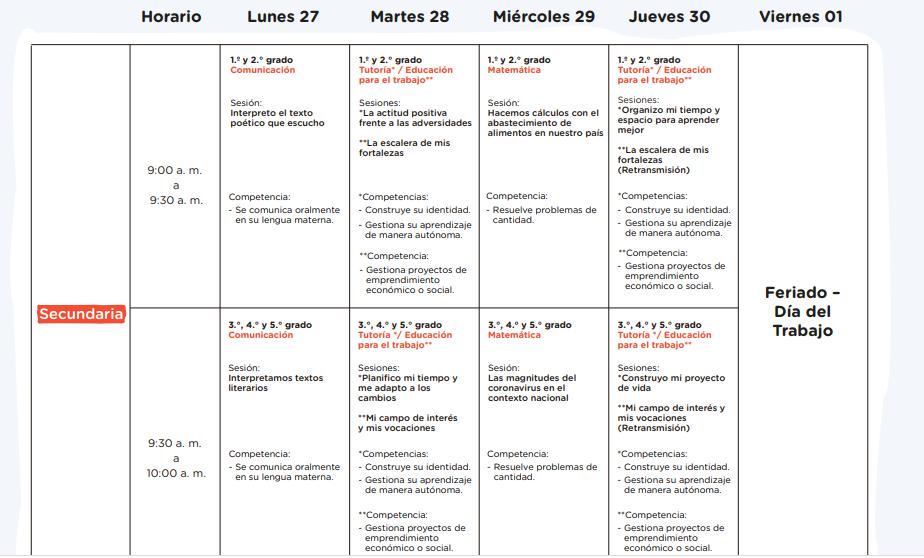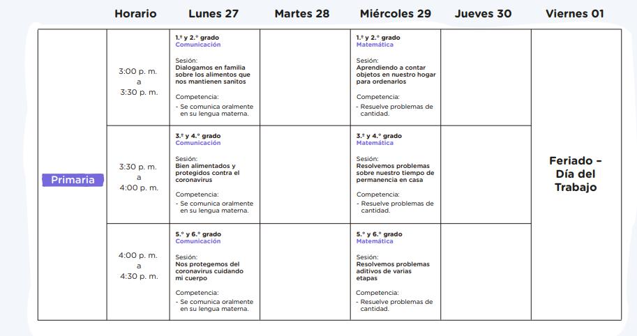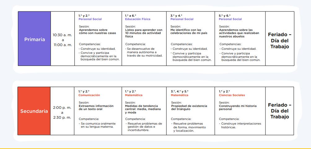 Este lunes 27 de abril, las clases volverán a ser transmitidas vía TV Perú, Radio Nacional y otros canales de señal abierta. Tras el fin de semana, los escolares de inicial, primaria y secundaria solo tendrán clases hasta el día jueves, teniendo en cuenta que el viernes el 1 de mayo, Día del Trabajador.