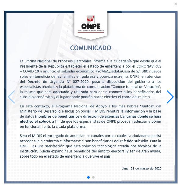 La Oficina Nacional de Procesos Electorales informa a la ciudadanía que desde que el Presidente de la República estableció el estado de emergencia por el Coronavirus y anunció el subsidio económico de 380 nuevos soles en beneficio de familias en pobreza o pobreza extrema, ONPE puso a disposición del gobierno a los especialistas técnicos y la plataforma de comunicación “Conoce tu local de Votación”, la misma que será adecuada y utilizada para dar a conocer a los beneficiarios del subsidio económico y el lugar donde podrán hacer efectivo el cobro del mismo