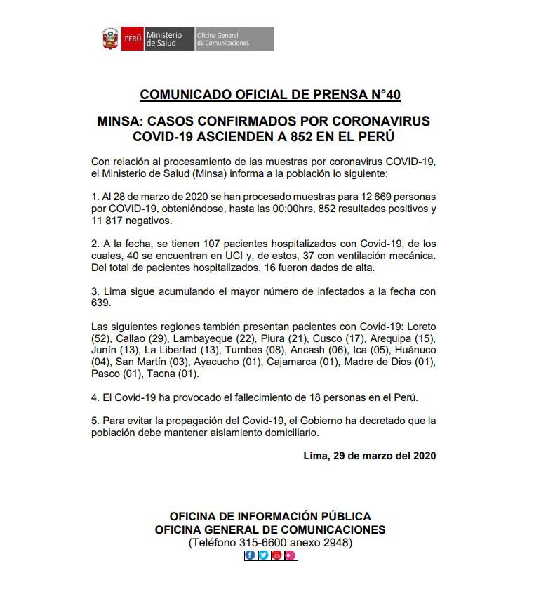 Cabe mencionar el comunicado fue publicado cerca de las 12:00 horas debido a que el presidente Martín Vizcarra no dará ninguna conferencia de prensa en Palacio de Gobierno, por ello se detalló cómo van los números hasta el domingo 29 de marzo.