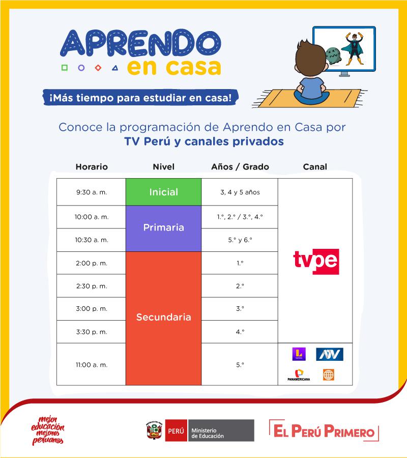 Cabe mencionar que Aprendo en Casa también tiene un espacio en los canales de Latina, ATV, América TV y Panamericana TV. Los horarios para poder sintonizar las clases son los siguientes: