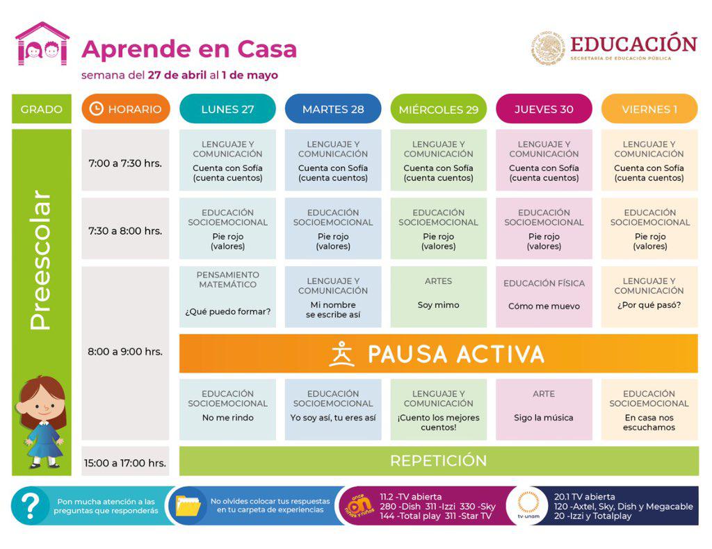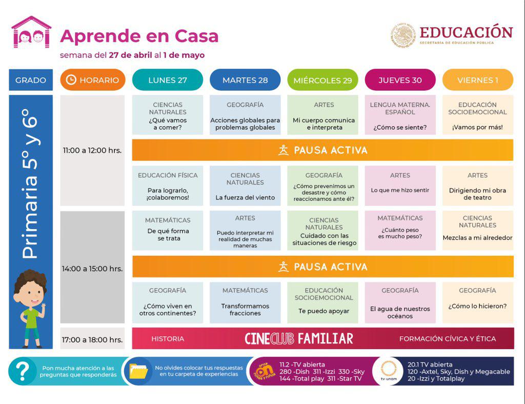 • Primero y segundo de primaria de 09:00 a 10:00; de 12:00 a 13:00 horas; y de 17:00 horas a 18:00 Historia, Cineclub Familiar de Formación Cívica y Ética.