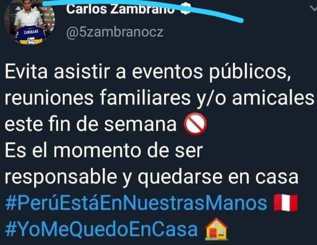 “Evita asistir a eventos públicos, reuniones familiares y/o amicales este fin de semana. Es momento de ser responsable y quedarse en casa. #ElPerúEstáEnNuestrasManos #YoMeQuedoEnCasa”, escribió Carlos Zambrano.