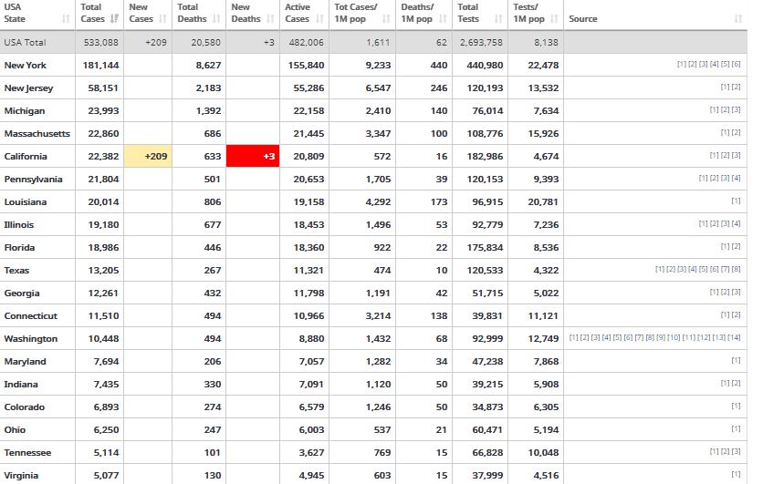 Estados Unidos es hoy en día el país que registra el mayor número de fallecidos por el nuevo coronavirus (COVID-19). Con más de 20 mil decesos, el país norteamericano supera ahora a Italia y España. El principal foco de infección sigue siendo la ciudad de Nueva York, donde se han reportado más del 40% de todos las muertes en USA.
